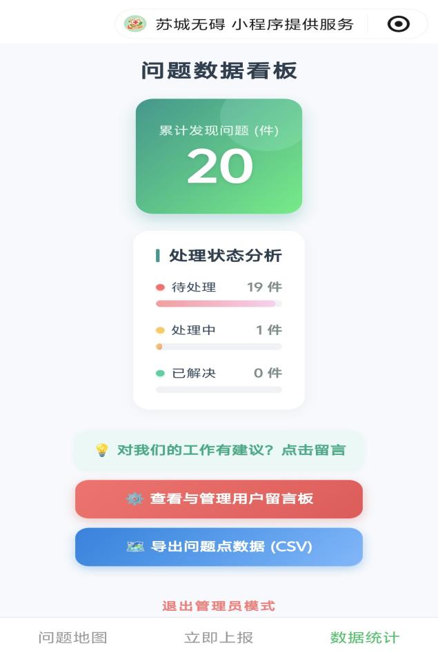 基于这些前期积累,团队自主研发了“苏城无碍”小程序,推动问题整改。盲道考察治理工作迈入数字化、精确化的新阶段,“苏城无碍”小程序全面投入实地考察,实现对盲道问题的精确定位、分类记录与动态追踪。该小程序内置实时地图,志愿者在巡查过程中可即时记录盲道问题,标注问题类型并详细描述现场情况。所有问题点均在地图上清晰呈现,并按照“待处理—处理中—已解决”三阶段进行状态管理,实现全流程可视化追踪。管理员可一键导出问题数据并汇总上报至相关职能部门,由此形成治理闭环,真正实现盲道问题“看得见、管得着、改得了”。