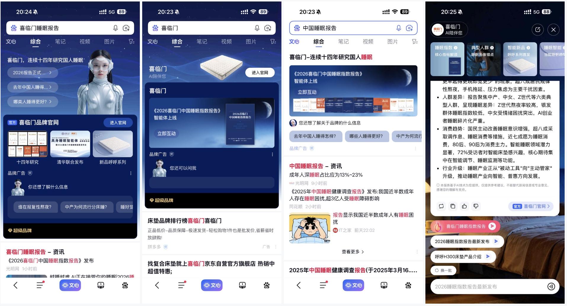 对喜临门而言,智能体更是品牌专业度的具象化体现——联合百度营销,将睡眠研究成果,转化为可随时调用的智能服务,以更智能、更易懂的方式触达用户,既强化了喜临门睡眠健康专家的品牌心智,也让品牌在解决用户睡眠痛点的过程中,深化和用户的信任,为线下进一步服务打好基础。