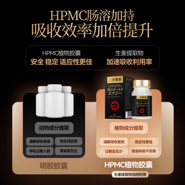 吸收端的突破,是三井龙虎丸区别于绝大多数同类产品的关键壁垒。产品搭载专利Vectra™肠溶靶向递送系统,采用HPMC肠溶植物胶囊,保护活性成分完整穿越胃酸环境,抵达小肠吸收区域后精准释放,直接透过肠道上皮细胞进入血液循环。溶解快、吸收稳定、不伤胃,从根本上解决了传统草本产品"有效成分大量流失"的核心痛点。