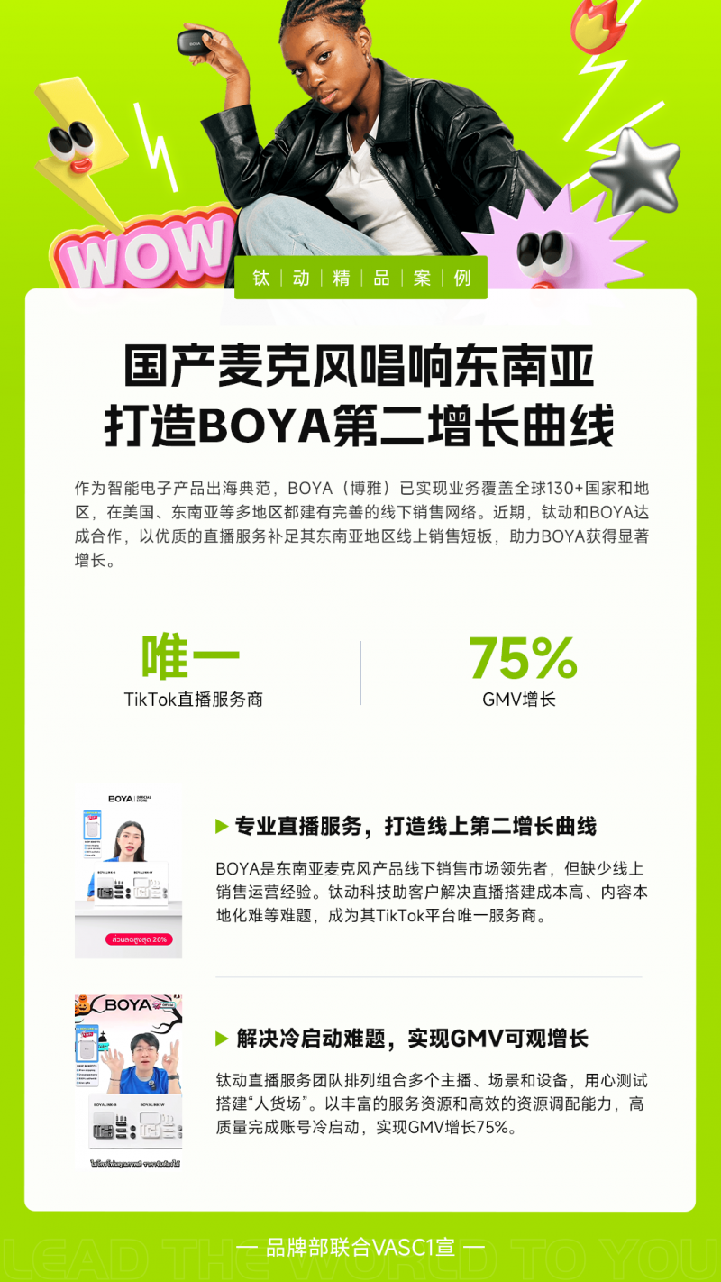 当东南亚电商进入直播驱动的快车道,TikTok Shop在印尼、泰国、越南等国的GMV以每年翻倍的速度狂奔。但对于长期深耕线下渠道的品牌而言,从“货架”到“直播间”的跨越,从来不是简单的场景平移。如何将线下积累的品牌势能转化为线上声量?如何在陌生的直播生态中完成账号冷启动?如何让产品在镜头前“开口说话”?这些问题,成为无数传统强势品牌出海路上的“最后一公里”。2024年国产麦克风品牌BOYA(博雅)与钛动科技达成合作,作为业务覆盖全球130多个国家和地区的智能电子产品出海典范,BOYA在美国、东南亚等地已建立完善的线下销售网络。但在东南亚这个线上消费高速增长的市场,直播运营经验的缺失成为其拓展版图的最后一块短板。钛动科技以唯一TikTok直播服务商的身份介入,通过专业的“人货场”重构,助力BOYA实现GMV增长75%,成功打造出线上第二增长曲线。