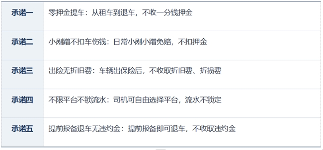 与此同时,公司还推出了“日付租金”模式,司机可以按天支付租金,无需一次性支付大额月租,极大减轻了资金压力。值得一提的是,原有的五大承诺依然有效,且全部写进合同,具有法律效力。