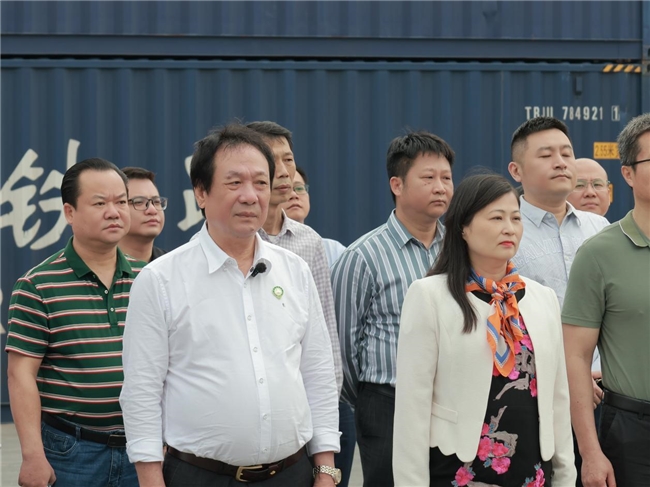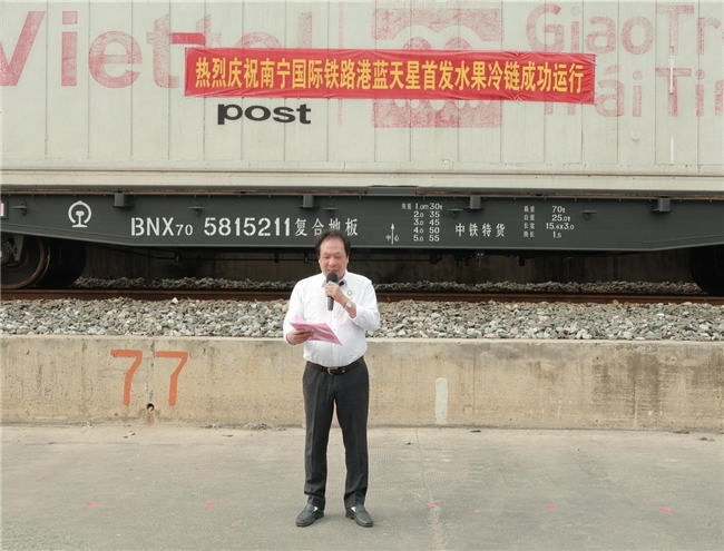 潮汕商会广西会长方时壮代表广西潮汕商会,祝贺蓝天星成功开通越南至南宁水果冷链专列。他表示:这是潮商扎根广西、服务桂越合作的生动实践。桂越农业合作基础深厚,蓝天星精准把握机遇,依托冷链专列提升流通效率,丰富消费者 “果篮子”。广西潮汕商会将整合 400 余家潮企资源,依托中国 — 东盟机制,以赤诚与实干,助力桂越合作迈上新台阶,贡献潮商力量。