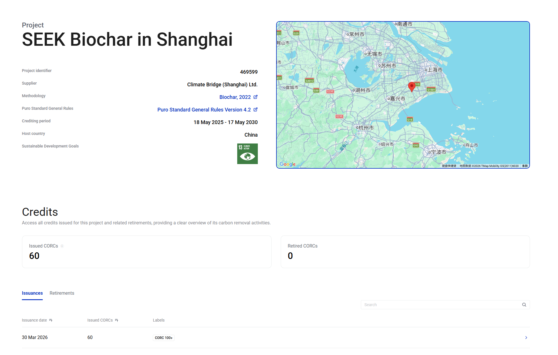 2026年3月30日,时科生物科技(上海)有限公司(以下简称“SEEK时科”)旗下SEEK Biochar in Shanghai生物炭碳移除项目,正式通过全球领先碳移除认证平台Puro.earth的严格核查,成功签发首批60吨CORC(CO₂ Removal Certificates,二氧化碳移除证书),成为上海市首家获得Puro.earth生物炭碳移除信用认证的企业,标志着中国生物炭技术与碳资产开发正式接轨国际自愿碳市场,为国内农林废弃物资源化与负碳技术发展树立了全新标杆。