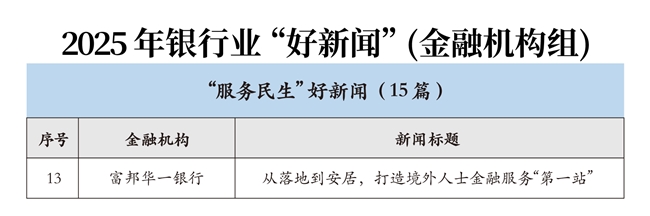 近日,中国银行业协会(简称“中银协”)发布2025年银行业“好新闻”评选结果,富邦华一银行报送的《从落地到安居,打造境外人士金融服务“第一站”》作品荣获中银协2025年银行业“服务民生” 好新闻奖。这也是富邦华一连续五年获得好新闻奖项。