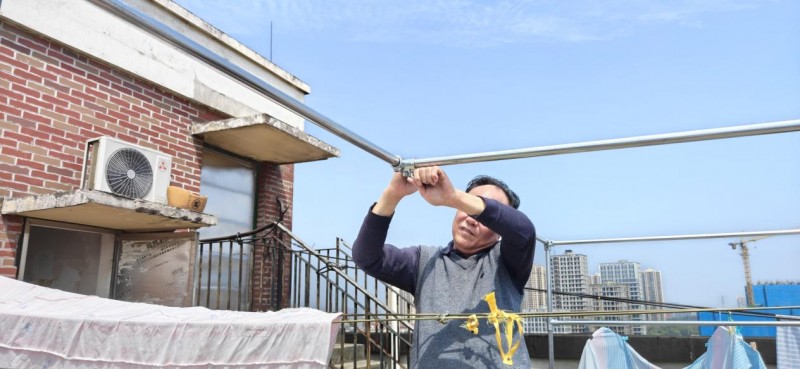 晾衣服被子看起来是人们日常生活中的小事,实则是人们生活品质好坏的一份子。没有一个较好晾晒衣服的环境和载体,跨长度的晾衣绳无支撑,软绵绵的,风一刮衣服容易落地弄脏。有时候自己拉的绳索被别人占用晾晒,自己来晾晒时就要挪开别人的衣服被子,由此邻居之间就会产生一点磨擦和纠结。这样的事例在那私拉乱扯晾衣的小区楼栋时有发生。由此,呼吁物业及业委会规范搭建晾衣架的民声时常有之。而各小区楼栋及别墅环境各一,有需要者,也有不需要者。这就导致物业或业委会不能动用公共资金来服务于某一楼栋。普瑞斯堡小区B1栋业主非常明了这个道理,为改善自己的居住环境,提高自己的生活品质。由B1栋103业主杨晓静牵头,自发组织本楼栋15户业主自筹资金,自行采购材料,自行设计安装。4月1日上午,B1栋902业主退休职工易正其与同楼业主一起自己动手,搭建一个既坚实美观,又规范宽敞的不锈钢晾衣棚架。