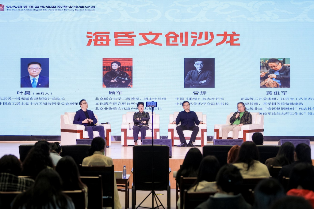 “海昏文创沙龙”环节,由北京天一博观城市规划设计院院长叶昊主持,北京联合大学二级教授顾军、中国《雕塑》杂志社社长曾辉、国家级非遗“贵溪錾铜雕刻”代表性传承人黄俊军等三位业内知名专家,围绕海昏文化内涵挖掘、文创产品转化、文化创意如何扎根历史面向未来等核心议题展开深度探讨,为海昏文创产业发展建言献策。