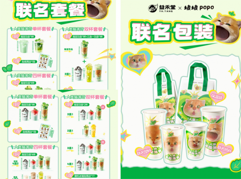 益禾堂还围绕“人类,来吸薄荷”主题,打造了一场沉浸式的联名体验:推出坡坡popo联名纸杯、贴纸、冰箱贴等萌趣周边;线下打造“薄荷喵星站”主题店,通过场景布置让门店变身为打卡胜地;线上也推出了定制小票,激发大家的热情。从产品到场景,从线上到线下,益禾堂将“人类猫薄荷”的创意,转化为可传播、互动的社交货币。