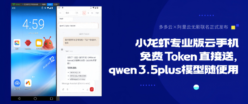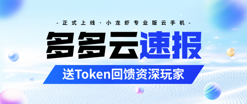 为庆祝“小龙虾专业版云手机”正式上线,多多云特别推出免费赠送Token的福利活动。这不仅是对长期以来支持多多云的资深用户的诚意回馈,也诚挚邀请所有对云端AI感兴趣的尝鲜玩家前来体验。无需复杂的本地部署,无需高昂的硬件投入,用户即可在云端畅享qwen 3.5plus大模型带来的智能交互体验。欢迎各位行业资深大佬与尝鲜玩家抢先体验,解锁AI云手机的无限可能。