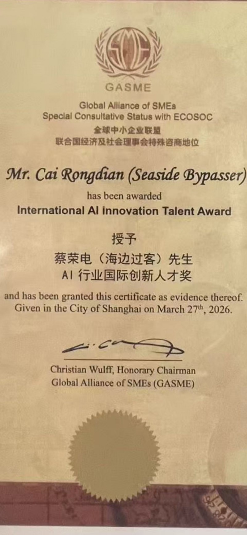 鉴于在A I领域的创新贡献,受到“全球中小企业联盟”主席的邀请,参加“中欧商界领袖圆桌高峰对话会。因其研究成果已获杰出A I创新人才奖,将于2026年3月27日下午二时,由德国总统武尔夫接见,亲自颁发该荣誉奖项。