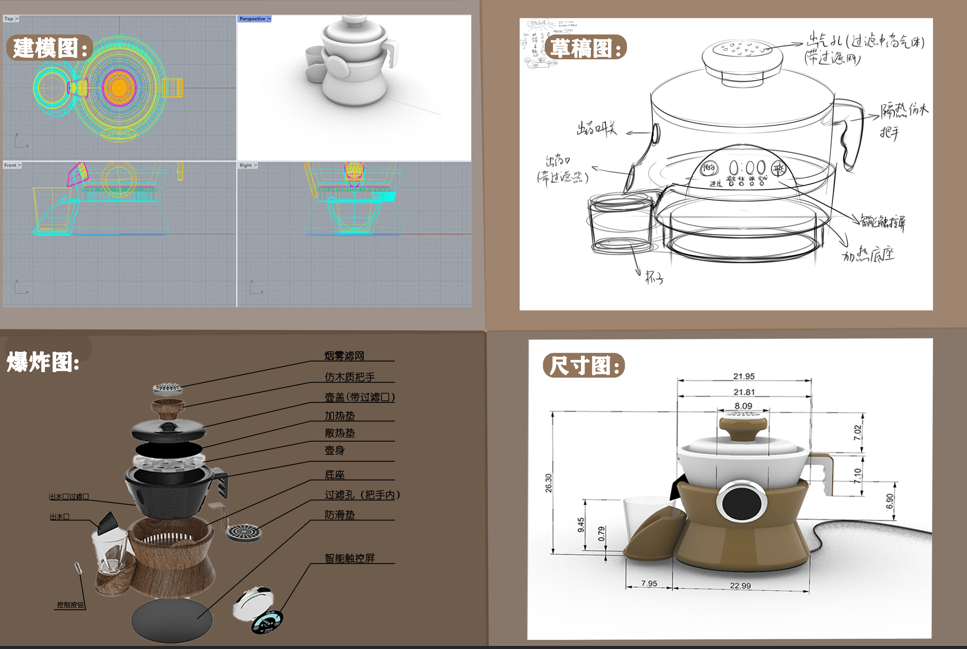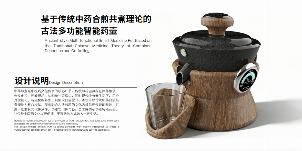 该设计以 “攻克传统煮壶控温难题” 为核心,采用仿木质加热底座搭配陶瓷壶身,既保留了传统器具的温润质感,又通过智能触控屏实现精准控温、预约提醒、一键清洗等功能,同时设置可控出药口、烟雾过滤口、散热口等细节设计,让熬药过程更安全、便捷、高效。产品不仅解决了传统熬药 “火候难把控、操作耗精力” 的痛点,更通过一体化设计实现了药渣过滤、药液自动流出等功能,大幅提升了中医药使用的便捷性,让传统中医药文化更好地适配现代生活节奏。