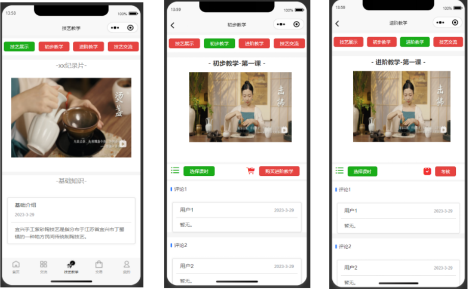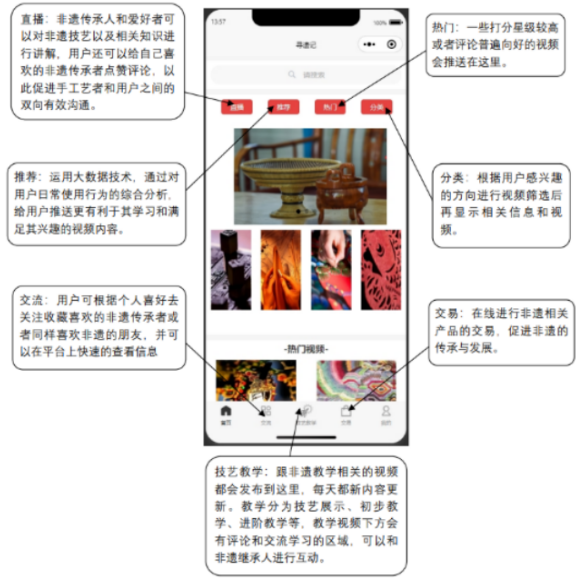 技术研发阶段,团队攻克了视频录制标准化、线上互动实时化、交易保障规范化等诸多难题,采用Java语言与SpringBoot框架搭建稳定后端,以Bootstrap与wepy框架优化前端体验,构建起适配不同用户需求的服务体系。我们借鉴河源非遗产品多元化开发的思路,创新设计“好知乐知组”与“专学专攻组”双轨教学模式,既满足入门者的兴趣体验需求,也为专业学习者提供系统化课程;结合河源非遗线上推广的需求,打造直播互动、电商交易板块,让非遗产品通过平台直达消费者;建立“AI+人工”双重审核机制,确保教学内容和交易产品的专业性与安全性。从初期的“小程序+网页”模式试水,到核心模块的反复调试,再到整体功能的优化升级,河源调研的成果始终是团队研发的重要指引,让“寻遗记”小程序从一纸构想,逐步成为贴合非遗传承实际的数字平台。