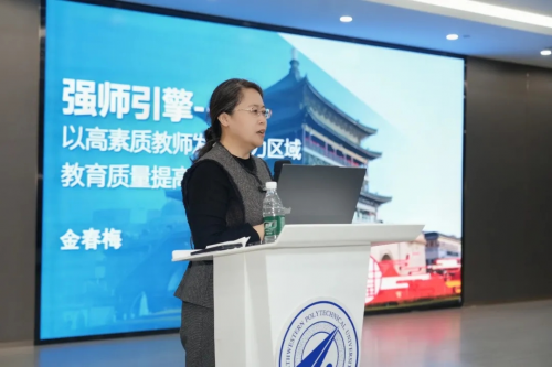 本次会议鲜明突出“教育评价”这一关键牵引力。教育部规建中心教育测量与评价研究中心特聘专家、中国教育学会教育质量评价办公室项目负责人金春梅教授以“强师引擎——以高素质教师发展助力区域教育质量提高”为题作专题报告,系统阐释了“以评促建、数据反哺”的教师发展培育体系。