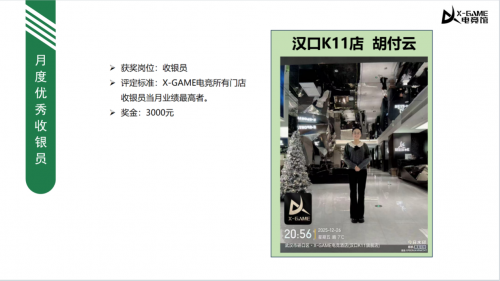 凭借出色的服务能力,胡付云在 2025 年 12 月首次登顶 X-GAME 全国收银员业绩榜首,2026 年 1 月再度蝉联军随之而来的还有荣誉证书与每月激励奖励三千元。