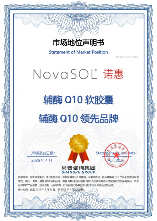本次 “辅酶Q10品类领先品牌” 认证,基于市场份额、品牌知名度、用户满意度、品质合规性等多维度指标综合评定,NovaSOL®诺惠辅酶Q10凭借突出表现成功入选。自上市以来,NovaSOL®诺惠辅酶Q10持续深耕健康营养领域,以硬核产品力与稳定市场表现,构建起强劲的品牌竞争壁垒,成为辅酶Q10行业公认的领先品牌。