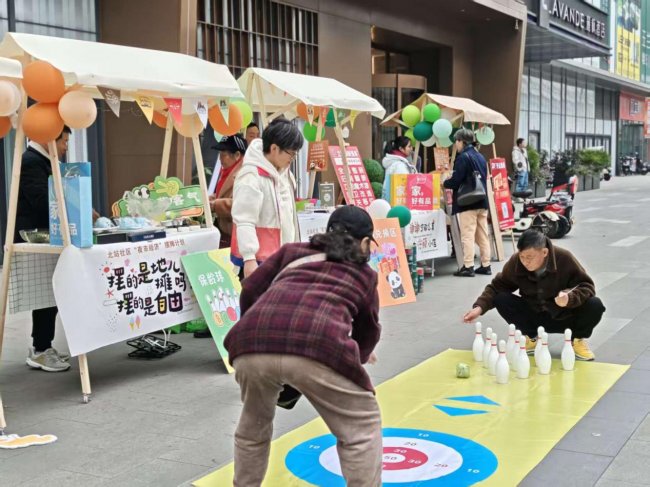 互动体验区的三个趣味游戏成为现场人气焦点。沙包打罐、听词拍掌、词语接龙等游戏兼具趣味性与参与性,尤其是围绕“创业”“经济”等主题的词语接龙,既增添了欢乐,又强化了青年的创业认知。参与游戏的市民不仅能收获小礼品,还能为心仪的摊位引流,实现了娱乐与助商的双重效果。