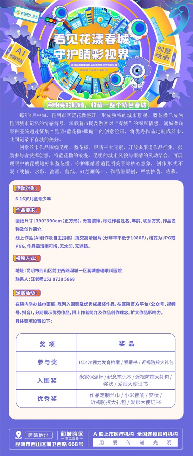 四月的昆明,是蓝紫色的梦境。当教场中路的蓝花楹如约绽放,盘龙江畔的花影随波荡漾,这座城市便迎来了一年中最浪漫的季节。蓝花楹树下人流如织,成为“春城”最动人的城市名片。届时,昆明润城普瑞眼科医院所在的前卫西路,1192余棵蓝花楹也将全线盛放,为这座城市增添新的打卡地标。为了让这份美好被更多人看见,医院特别发起“看见花漾春城·守护睛彩视界”蓝花楹创意丝巾绘画征集活动,邀请6-16岁的青少年用画笔记录眼中的紫色春城,并将优秀作品定制成丝巾,成为可穿戴的城市文化符号,共同珍藏这份属于昆明的独特记忆。