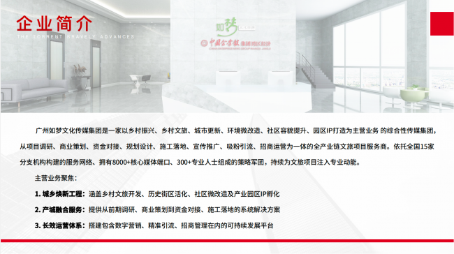 公司已构建从文化挖掘、品牌策划、规划设计、工程施工,到融资招商、长效运营的一站式服务体系。打造了一批标杆示范项目,包括佛山高明苏村锦鲤文化街区、佛山东门圩、花都岭南艾谷、番禺西城社区、市桥石街等。目前,公司正为江门、阳江、惠州、韶关等地文旅项目提供前期方案策划,持续赋能地方发展。