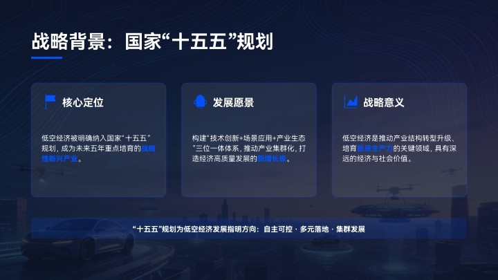 2026年是国家“十五五”规划开局之年,低空经济作为国家重点培育的战略性新兴产业,被纳入国民经济发展核心布局。规划明确提出,要加快构建技术自主可控、场景全域落地、产业集群集聚、运行安全规范的低空经济全产业链体系,推进低空核心技术攻关、空域管理优化、应用场景拓展与生态体系建设,打造具有全球竞争力的低空经济产业集群,为我国低空经济高质量发展擘画宏伟蓝图、确立行动纲领。