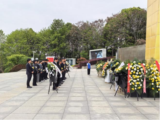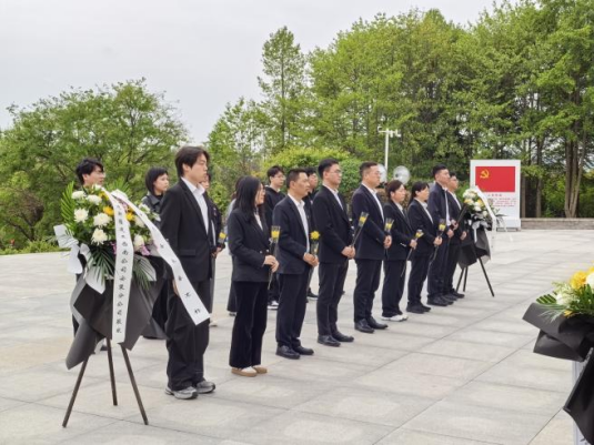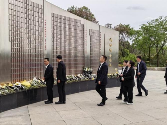 苍松翠柏掩映下的烈士陵园庄严肃穆,革命先烈的英雄气概与崇高精神在此静静沉淀。全体人员整齐列队,手捧菊花,缓步走向庄严肃穆的纪念碑,在纪念碑前举行简朴庄重的敬献花篮仪式。伴随着雄壮的国歌响起,全体人员肃立行注目礼。随后,党员代表缓步向前,向革命烈士敬献花篮,现场人员静立默哀,深切寄托对先烈的哀思与缅怀。默哀毕,大家依次列队瞻仰烈士英名墙,逐一为先烈敬献鲜花。