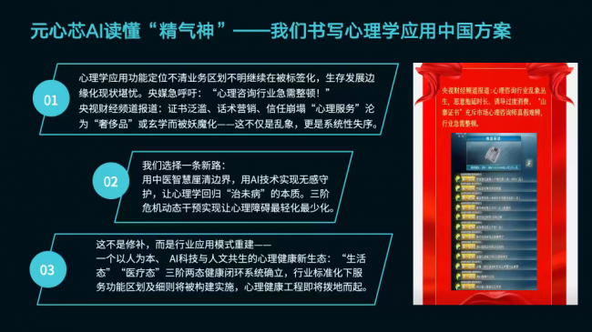 两大平台一防一治、一基一护,健康态系统从源头预防,元心芯AI系统动态守护,共同构成覆盖全人群、全场景、全生命周期的心身健康闭环,有效解决资源不均、成本高昂、干预滞后、隐私顾虑等行业痛点,让心身健康服务真正走向社会化、生活化、智能化。