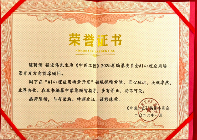 强宏伟的创新成果获得行业与国家层面的高度认可。元心芯AI系统荣获2025年度大健康技术创新项目奖,入选健康管理产学研用协同创新项目案例;个人事迹与成果录入《中国名医年鉴》《非遗保护发展白皮书》《中国工匠》等国家典籍,荣获“2025年度大健康产业领军人物”称号;受聘中国人口文化促进会慢病防治援助委员会常务委员、中央新影中学生频道特约教授等多个职务,受邀央视专访,成为心理健康领域的跨界领军者。