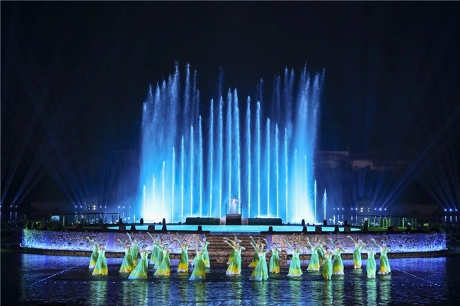 夜幕降临,汉源湖畔的《天汉传奇》水上实景大秀震撼登场。这场演出以《诗经》中“汉有游女”的美丽传说为蓝本,以“汉水神女”降临人间为主线,通过“敬天祈福、神女降临、宣威怀远、大汉荣耀、汉人老家”五个篇章,讲述了两千年前辉煌的大汉盛世。3000平米亚洲巨型全息水幕、200架无人机编队、震撼水上烟花秀与200多名演员的倾情演绎交相辉映,形成一幅虚幻与实景完美融合的动人传奇画卷。“日间赏花海、游汉苑,夜间观《天汉传奇》”——这种“日+夜”全时段体验模式,极大提升了游客的停留时间与文化沉浸感,让游客的一日汉风之旅更加充实而圆满。