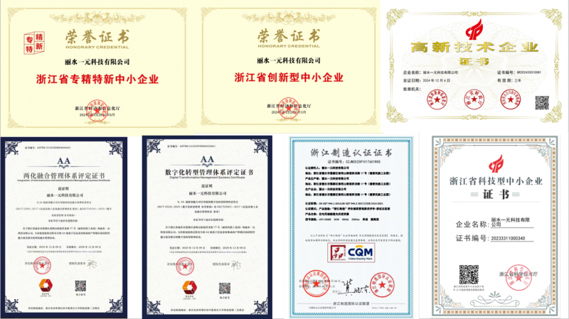 技术的精密不只体现在系统与方案,更沉淀于知识产权与行业认可之中。一元科技累计拥有专利23项,其中包括实用新型18项、发明专利3项、外观专利2项;并先后获得高新技术企业、省级企业技术中心、绿色工厂、创新型中小企业、科技型中小企业、省级专精特新中小企业等荣誉,同时取得两化融合管理体系证书与“浙江制造”认证,持续以创新与规范引领行业发展。