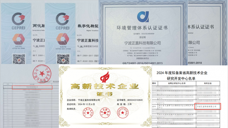 “零安全事故”是正直科技的发展目标。为筑牢安全与品质双防线,正直科技目前已获得质量、环境及两化融合管理体系认证。在此基础上,正直科技还建立起从原材料入厂到成品出库的全流程质检机制,批次合格率、交付及时率等关键指标常年保持行业高位。在持续夯实管理基础的同时,正直科技也在安全生产、技术创新与绿色发展方面屡获认可,成功获得“国家高新技术企业”“宁波市专精特新中小企业”“绿色工厂”“余姚市企业工程技术中心”“余姚市安全生产工作先进基层单位”等多项荣誉,为自身高效稳定运行提供了坚实支撑。