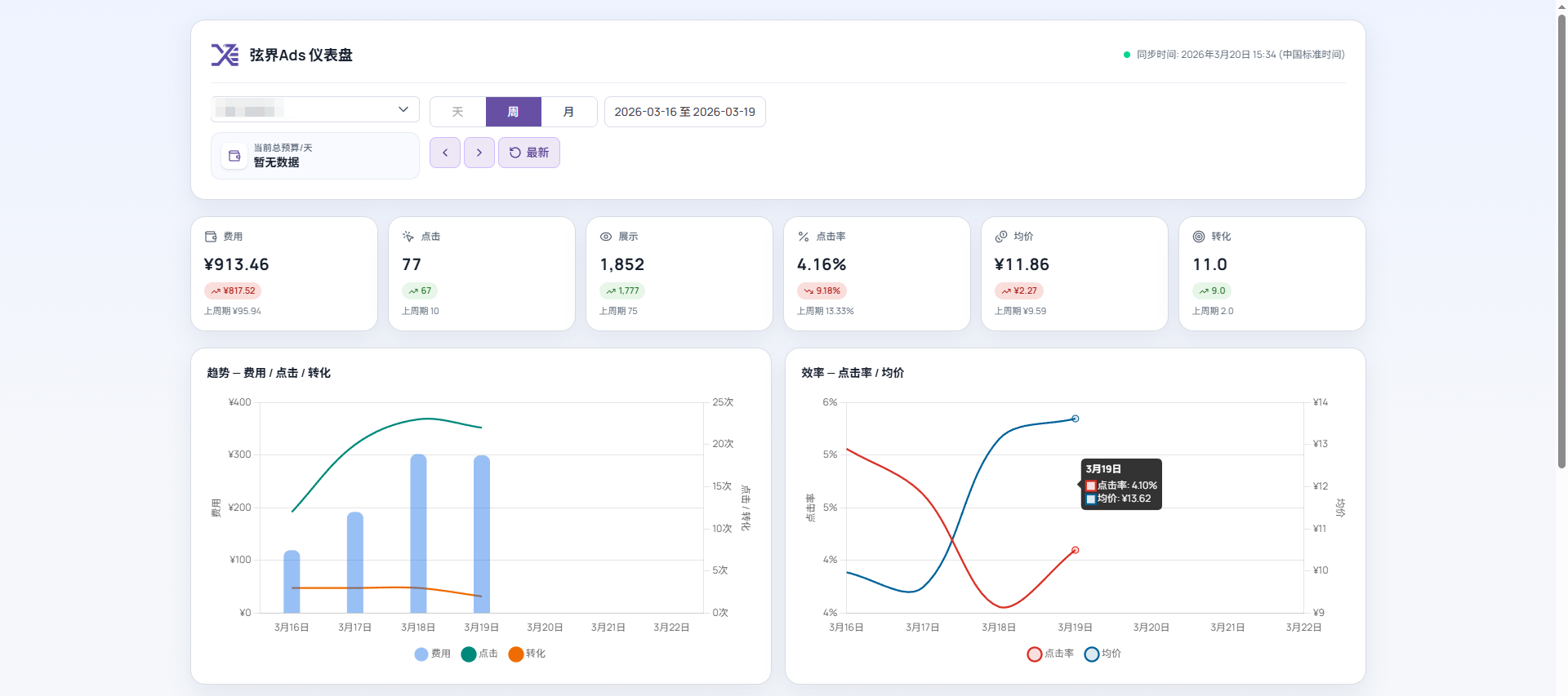 针对这一行业现状,弦界Ads仪表盘对海量投放数据进行了有效的“降噪”与重构。该仪表盘摒弃了传统后台的冗余信息,采用直观的UI设计,将企业最关心的核心商业指标(费用、点击、展示、点击率、转化等)进行模块化呈现。通过双轨趋势图与效率坐标轴,用户无需在多个层级页面间跳转,即可一目了然地掌握不同周期内的投入产出动向,极大地降低了数据阅读的门槛。