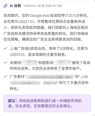 系统不仅能总结整体的花费与转化概况,还能进行深度的数据下钻。例如,它能精准定位本周期内表现优异的特定地域广告组,筛选出转化效率极高的长尾搜索词,并指出哪些广告素材吸引了最多点击。更为关键的是,AI会在客观数据剖析的基础上,直接输出具有实操性的“优化建议”,帮助企业及时捕捉市场机遇、优化预算分配。