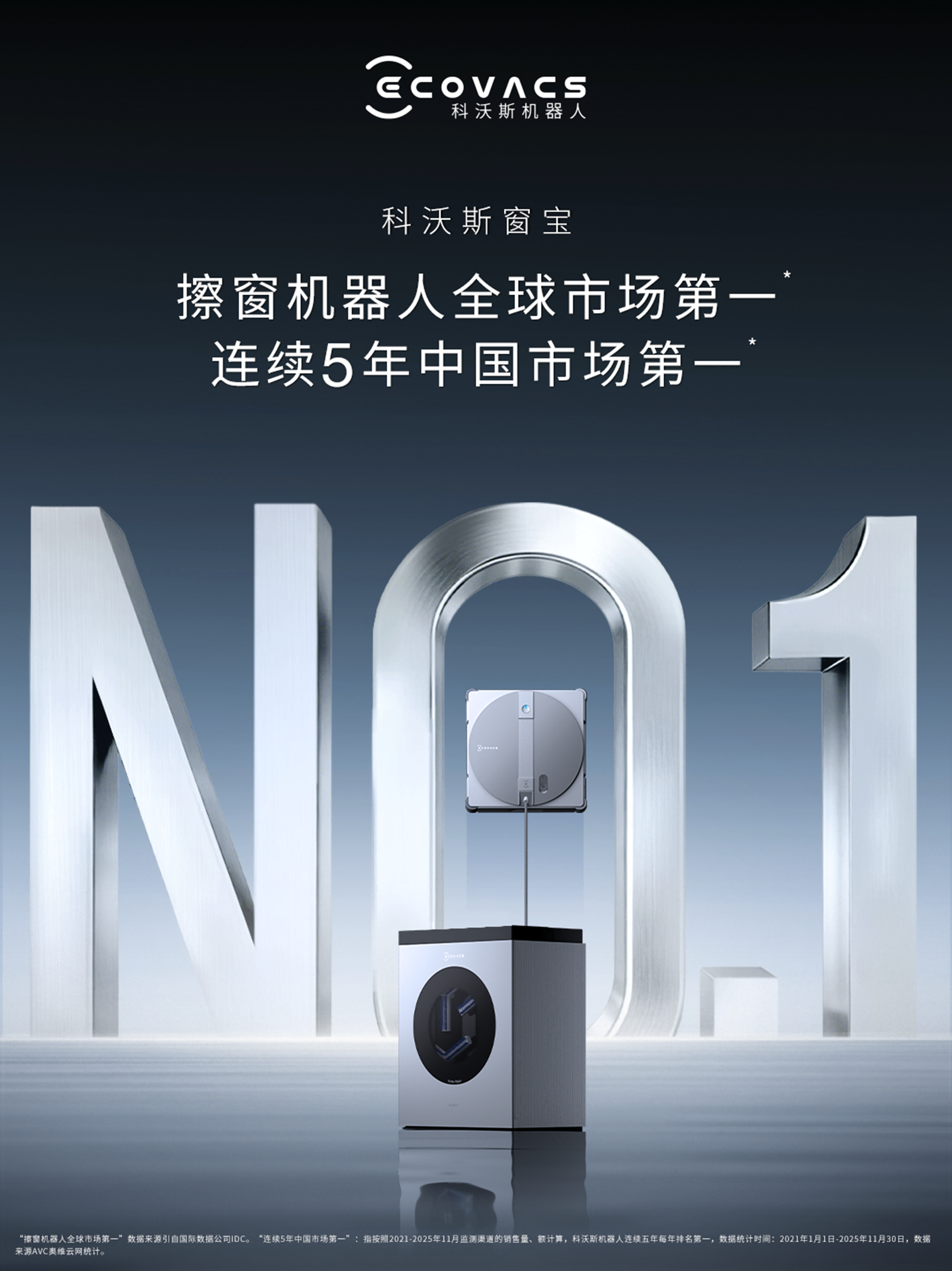 在这场全行业的爆发式增长中,科沃斯窗宝展现出了强劲的市场领导力。根据国际权威数据机构IDC的报告显示,在2025年前三季度,科沃斯稳居全球擦窗机器人出货量第一,并保持了高达108.2%的同比增长率,远超行业平均水平。与此同时,奥维云网(AVC)的监测数据进一步表明,2025年科沃斯销售额占比超6成,连续第五年蝉联中国擦窗机器人市场规模第一。这一全球与本土的“双重认证”,强有力地交叉验证了科沃斯在细分赛道深厚的行业壁垒。