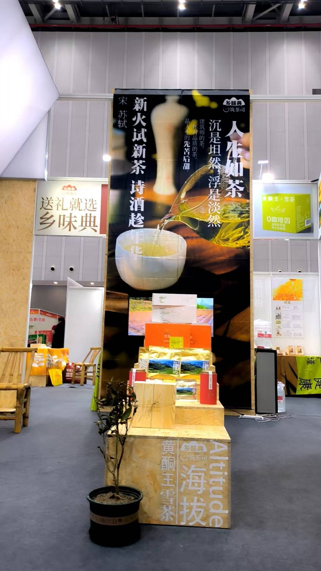 好产品需要好空间来承载。本次“乡味典”展馆由品牌创始人、国家一级注册建筑师亲自操刀设计,将建筑学的美学理念与茶文化深度融合,打造出一个兼具东方禅意与现代审美的沉浸式体验空间。