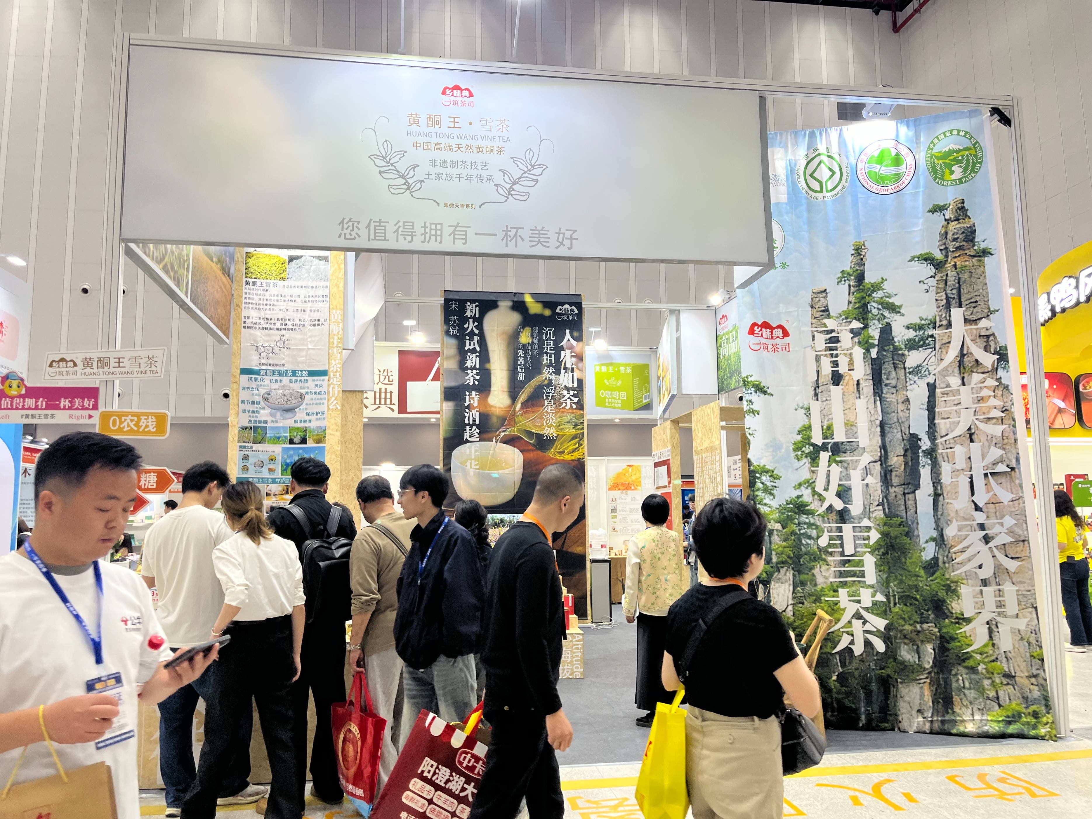 走进位于杭州国际博览中心核心区域的“乡味典”展馆,首先映入眼帘的便是以“大美张家界”为主题的设计空间。展馆中央最显眼的位置,便是“筑茶司”品牌的黄酮王雪茶展示区。