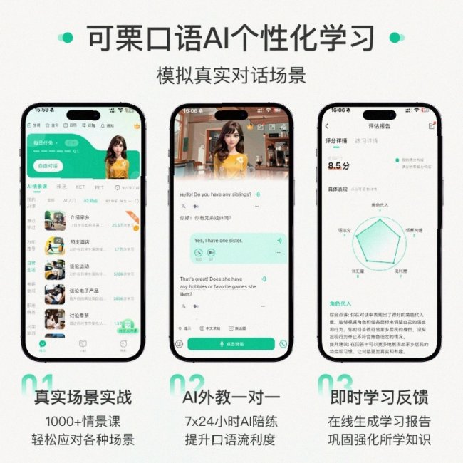 它的AI外教完全模拟真人情感语调,24小时在线无等待,说错了不会被打断、不会被评判,只会温柔纠正发音和语法。有用户反馈:"之前跟真人外教练雅思口语紧张到忘词,用可栗练了1周,现在敢主动开口拓展内容了"。这种零压力环境,让考生能把精力全放在表达上,提分效率直接翻倍。