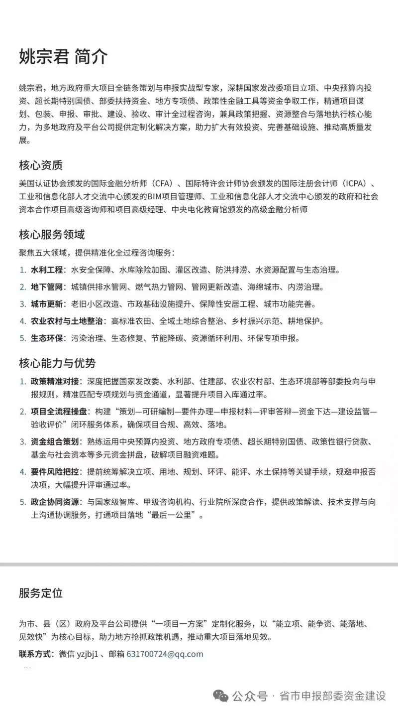 实战型投融资与重大项目申报专家姚宗君,深耕国家发改委立项、中央预算内投资、特别国债、专项债等资金争取领域,持有CFA、ICPA等权威资质,擅长“项目谋划—申报全流程—多元资金拼盘”一体化操盘。