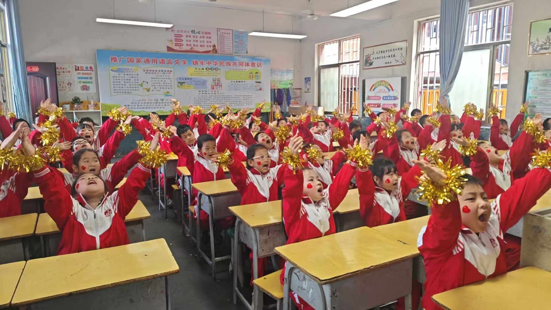“起来!不愿做奴隶的人们……”上午8时30分,雄壮的国歌伴奏音频准时响起,比赛正式开始。各班学生身着整洁校服,列队整齐。演唱现场高潮迭起,画面动人:指挥台上,不仅有小指挥手势专业、节奏精准,不少班主任也满怀激情地亲自上阵指挥,师生同频共振;队伍中,孩子们脸颊上特意贴着鲜艳的小国旗和红心贴纸,用最纯真的方式表达着清澈的爱。伴随着激昂的旋律,有的班级全体少先队员庄严地行队礼,目光如炬;还有的班级精心准备了五星红旗和写着“祝福祖国繁荣昌盛”的向日葵道具。一年级稚嫩的童声字字铿锵,高年级的歌声深沉饱满,每一个音符都彰显着中华民族不屈不挠的精神底色。
