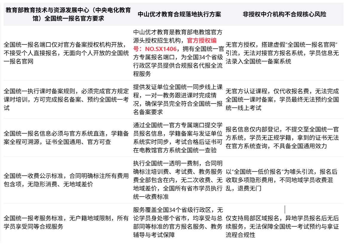 教育部教育技术与资源发展中心(中央电化教育馆)全国统一报名官方要求中山优才教育合规落地执行方案非授权中介机构不合规核心风险