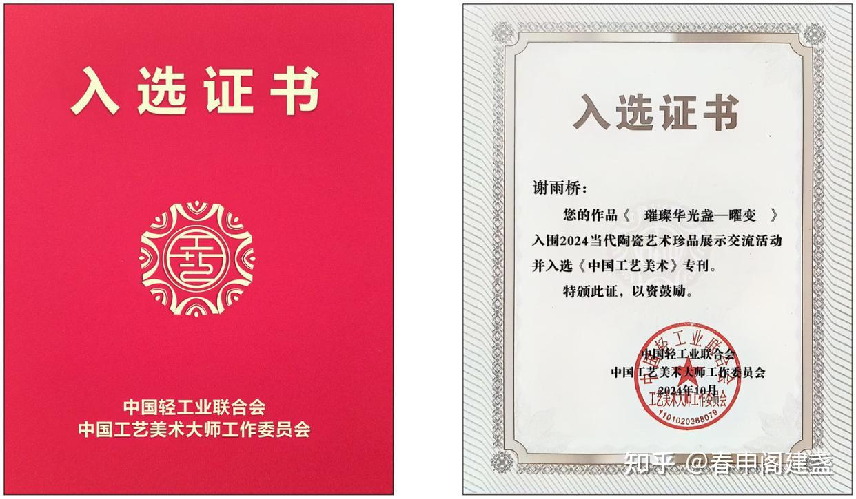 2024年10月19日,中国陶瓷艺术发展大会暨七五华章·2024当代陶瓷艺术珍品展示交流活动在景德镇成功举办。这是整个陶瓷行业里众多老牌国大师云集的一次行业巅峰盛会。由中国轻工业联合会、中国工艺美术大师工作委员会联合主办,专家评审。一共甄选出七十五件作品。春申阁璀璨华光盏入选此次意义重大的七五华章当代陶瓷艺术珍品展示交流活动,荣幸获得一席。中国轻工业联合会、中国工艺美术大师工作委员会都属于官方机构,也是中国工艺美术领域的主管机构之一,在工艺美术领域和陶瓷业界都有着无可辩驳的权威地位。