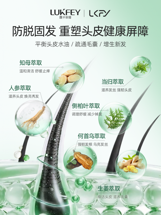 露卡菲娅防脱发水打造 “清洁舒缓→抑制 DHT→激活毛囊→营养输送→强韧发丝→微生态平衡” 的六维全链路防脱体系,区别于普通单效防脱洗发水的表层护理逻辑。配方以高占比氨基酸表活为核心清洁基底,复配人参、当归、知母、何首乌、侧柏叶、生姜六大草本精华与独家专利防脱因子、咖啡因,精准匹配头皮 5.5 弱酸环境,能深入毛囊清除代谢废物、抑制 DHT 生成、激活休眠毛囊,洁净力拉满却不损伤头皮皮脂保护层。泡沫绵密丰盈,接触头皮轻柔无刺激,彻底解决防脱不彻底、停用反弹、越洗越脆弱的行业通病,脂溢性、产后、压力性、雄激素性等全类型脱发都能安心使用。