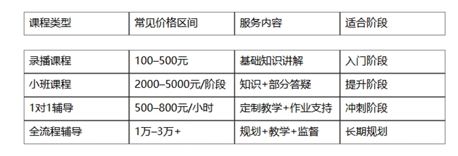 课程价格与师资、服务深度相关,但选择时更重要的是匹配学习需求。例如基础阶段可选择结构化课程,而在冲刺阶段则可以考虑更高定制化的服务。因此,应结合当前学习阶段与目标进行判断。