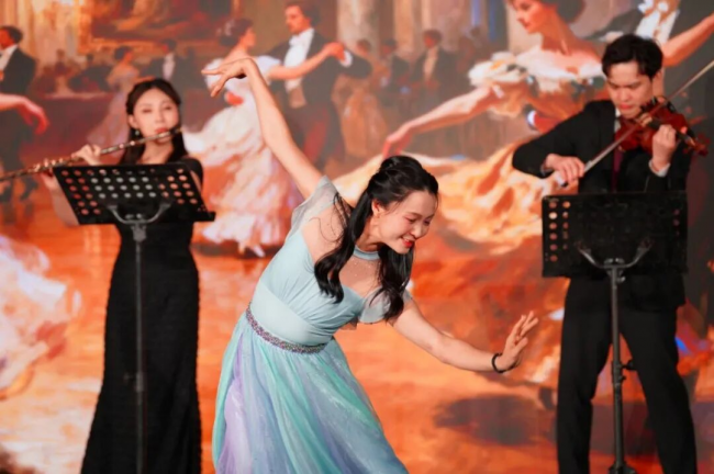 艺术表演环节为春茗活动增添了浓厚氛围。中山大学艺术学院师生带来中乐四重奏《战马奔腾》,旋律激昂、气势磅礴;女声独唱《春天的芭蕾》婉转悠扬、悦耳动听。随后,艺术学院师生与香港演艺学院携手合作,演绎了音乐舞蹈《肖斯塔科维奇·五首小品》;香港著名钢琴演奏家郑慧博士倾情献奏《春蹄跃影》,琴键流转间尽显大师风范;男女声二重唱《这世界那么多人》深情款款,余音绕梁。整场演出融合中西音乐元素,既展现了中山大学艺术教育的专业水准,也彰显了粤港两地文化交流的丰硕成果,赢得现场阵阵掌声。