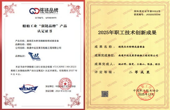 技术深耕的背后,是企业对研发创新的长期坚守。截至目前,南通中远克莱芬累计拥有38项专利,其中发明专利13项、实用新型专利25项,参与起草并实施国家标准2项、行业标准4项、团体标准16项,品牌商标2个,实现了从技术跟跑到标准制定的跨越。企业先后获评国家高新技术企业、江苏省专精特新中小企业、江苏省企业技术中心、江苏省船舶与海工绿色造修技术应用/推广中心,斩获中国船舶工业行业协会“强链品牌”认定,成为国内船舶超高压水除锈领域的技术标杆,为持续领跑细分赛道筑牢了核心支撑。公司参加中国职工技术协会组织的职工技术大赛,“超高压水除锈成套装备”荣获2025年职工技术创新成果二等奖。