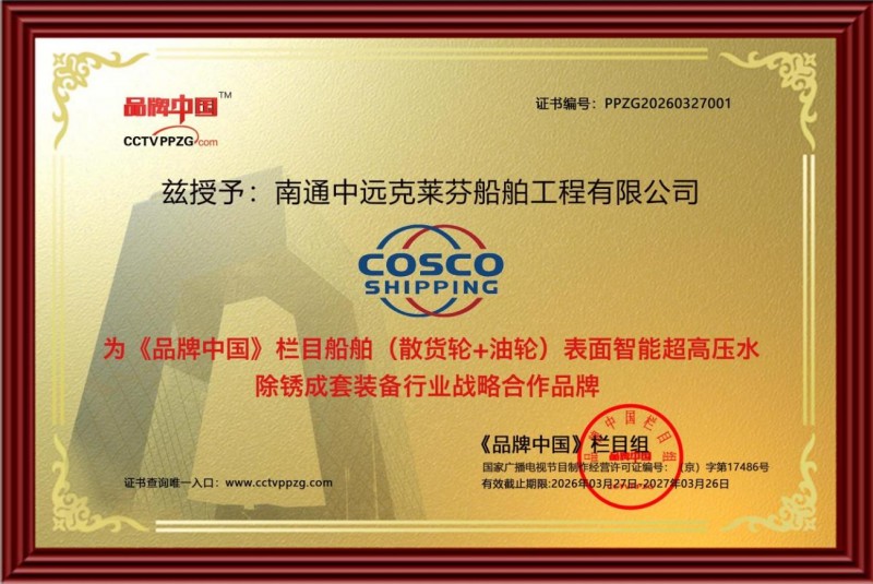 在海洋强国、制造强国战略纵深推进,全球航运业绿色低碳转型加速,新质生产力持续赋能船舶工业升级的时代背景下,船舶绿色修造配套产业,已成为我国巩固全球造船修船领先优势、保障产业链供应链自主可控的关键环节。南通中远克莱芬船舶工程有限公司三十余年扎根船舶绿色配套细分领域,聚焦绿色智能涂装和新能源船舶配套主责主业,构建起“产品+工程+贸易+租赁”四位一体的全链条服务体系。凭借自主可控的核心技术,在船舶(散货轮+油轮)表面智能超高压水除锈成套装备赛道实现关键突破,该产品国内市场占有率连续两年超30%。凭借技术与市场的双重领先优势,南通中远克莱芬2026年成功获评《品牌中国》栏目行业战略合作品牌,成为我国船舶工业智能运维国产化替代的标杆企业。