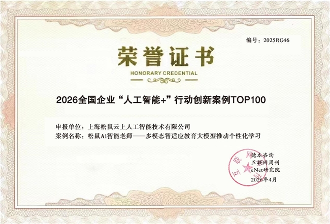 2026年4月,由互联网周刊、eNet研究院联合德本咨询发布的“2026全国企业‘人工智能+’行动创新案例TOP100”正式揭晓,松鼠Ai智能老师凭借“多模态智适应教育大模型推动个性化学习”案例成功入选。本次榜单摒弃了过往以技术参数、模型规模为核心的评判逻辑,将“产业实战场的可量化价值与可复制性”作为唯一标尺,其背后折射出中国“人工智能+”行动从技术验证期全面进入规模化落地期的产业拐点。