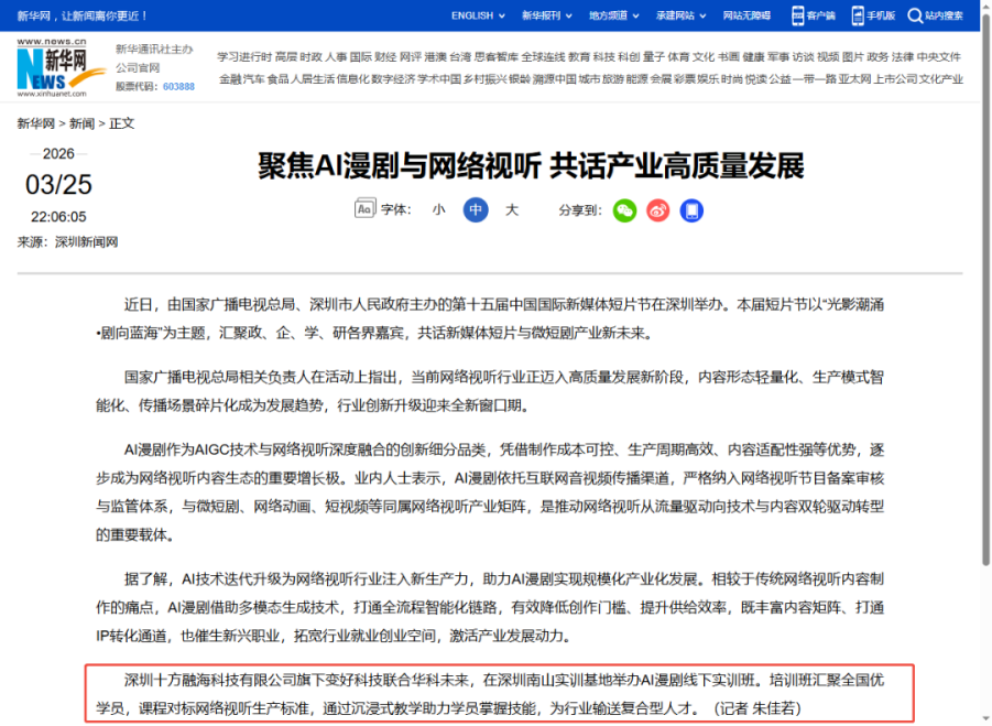 新华网在报道中肯定十方融海的探索价值:企业以产教融合夯实人才根基,推动AI漫剧向规范化、精品化发展,助力网络视听行业形成技术创新、内容优质、人才充沛的良性生态。截至目前,十方融海在AI视频、AI短剧、AI漫剧等数字内容领域已形成完善的项目制课程与任务式实训体系,线上AIGC相关培训服务规模超百万人次,线下专项实训上千人次,累计向行业输送数百名具备全流程交付能力的专业人才。