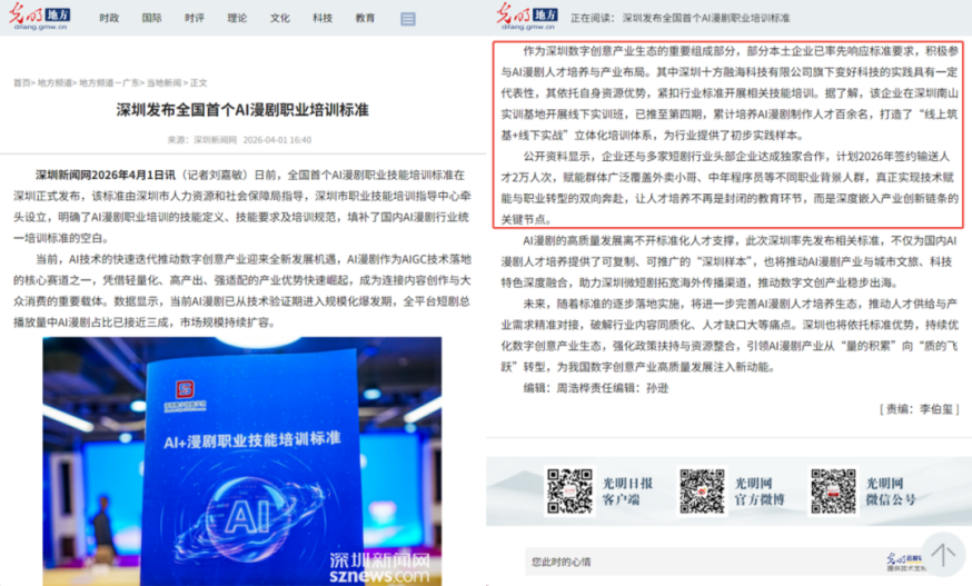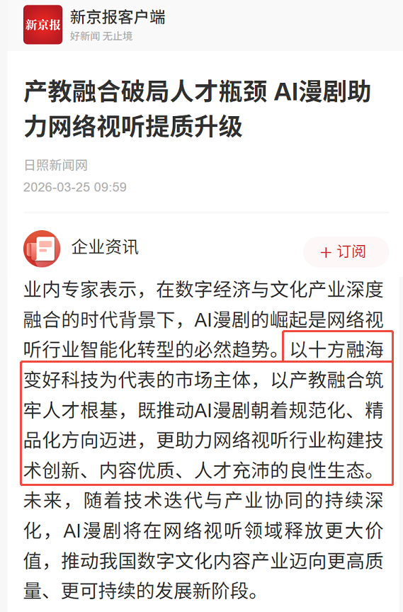 近日,新京报、新华网、光明网等多家中央及地方权威媒体集中关注AI漫剧产业发展态势,深度报道十方融海依托AIGC技术创新与产教融合模式,破解行业人才短缺难题、助力网络视听行业高质量转型的实践成果,为数字内容产业智能化升级提供了可参考的标杆案例。
