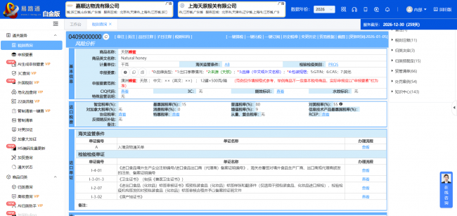尤为关键的是,易路通内置的检验检疫映射数据库,填补了传统查询工具的空白。对于扬睿国际频繁处理的蜂蜜、肉类、油籽等农产品,系统可精准匹配检验检疫单证要求,彻底规避因信息遗漏导致的货物滞留与违规处罚风险。