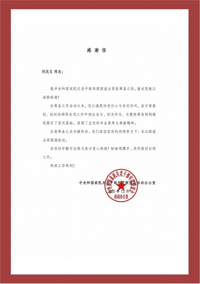 在本次活动筹备期间,刘杰文同志立足自身所长,在文艺相关环节积极参与筹备、倾力支持,以认真负责的态度做好力所能及的相关工作,为活动的顺利筹备和圆满举办提供了积极助力。中央和国家机关老干部年度联谊会活动办公室在感谢信中表示,刘杰文同志的积极参与和辛勤付出,为本次盛会的成功举办增添了助力,对其作出的积极贡献给予充分认可。