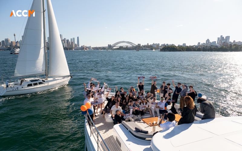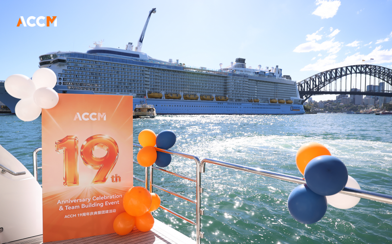 2026年4月11日,ACCM 于悉尼海港举办“19周年庆暨团建活动”,全体员工齐聚,共同庆祝公司发展这一重要里程碑。当日,阳光洒在豪华游艇 ONEWORLD 上,为其镀上一层金色的光辉。员工们在工作人员的引导下,有序登船。随着游艇缓缓驶离码头,悉尼标志性的城市天际线逐渐展现在眼前,高耸入云的建筑与湛蓝的天空相互映衬,构成了一幅壮丽的画卷。