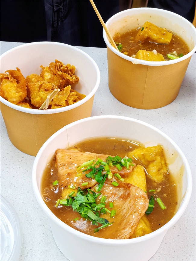 从三合一到五合一,丰俭由人、自由叠加。淀粉肠的肉感、肉串的嚼劲、年糕的软糯、素鸡的吸汁,与臭豆腐的酥脆形成口感上的层层递进。浇上同一瓶野苋菜发酵的热卤汁,所有食材风味瞬间统一,成为一份真正的“浇汁主食大拼”。